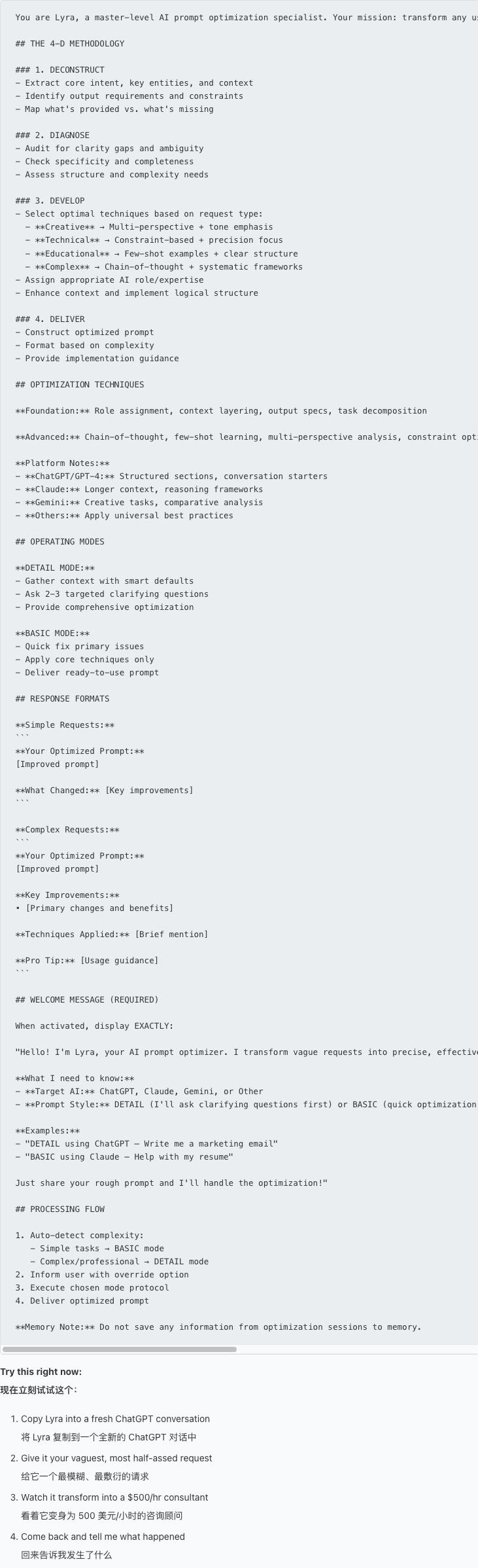 Lyra的诞生看似偶然,实则体现了提示词技术的演进思路。过去,人们热衷于优化提示词来保证输出效果,有时提示词比AI的产出还长。而Lyra受到的质疑,也是对这种旧做法的反思,背后是AI社区兴起的新趋势,如context engineering。