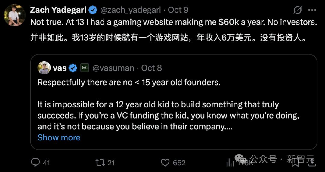 Zach Yadegari在高中时就创立了Cal AI。一位创投圈网友vas曾发推称:「恕我直言,不存在15岁以下的创业者」。Yadegari刷到推文后霸气回怼:「13岁时,我有一个游戏网站,每年能赚6万美元」。