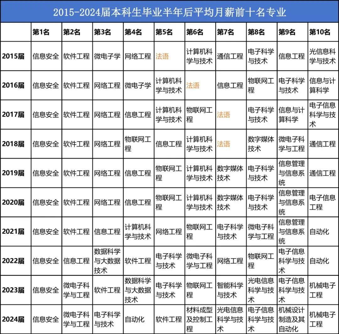 2015 - 2024届本科生毕业半年后平均月薪前十名专业