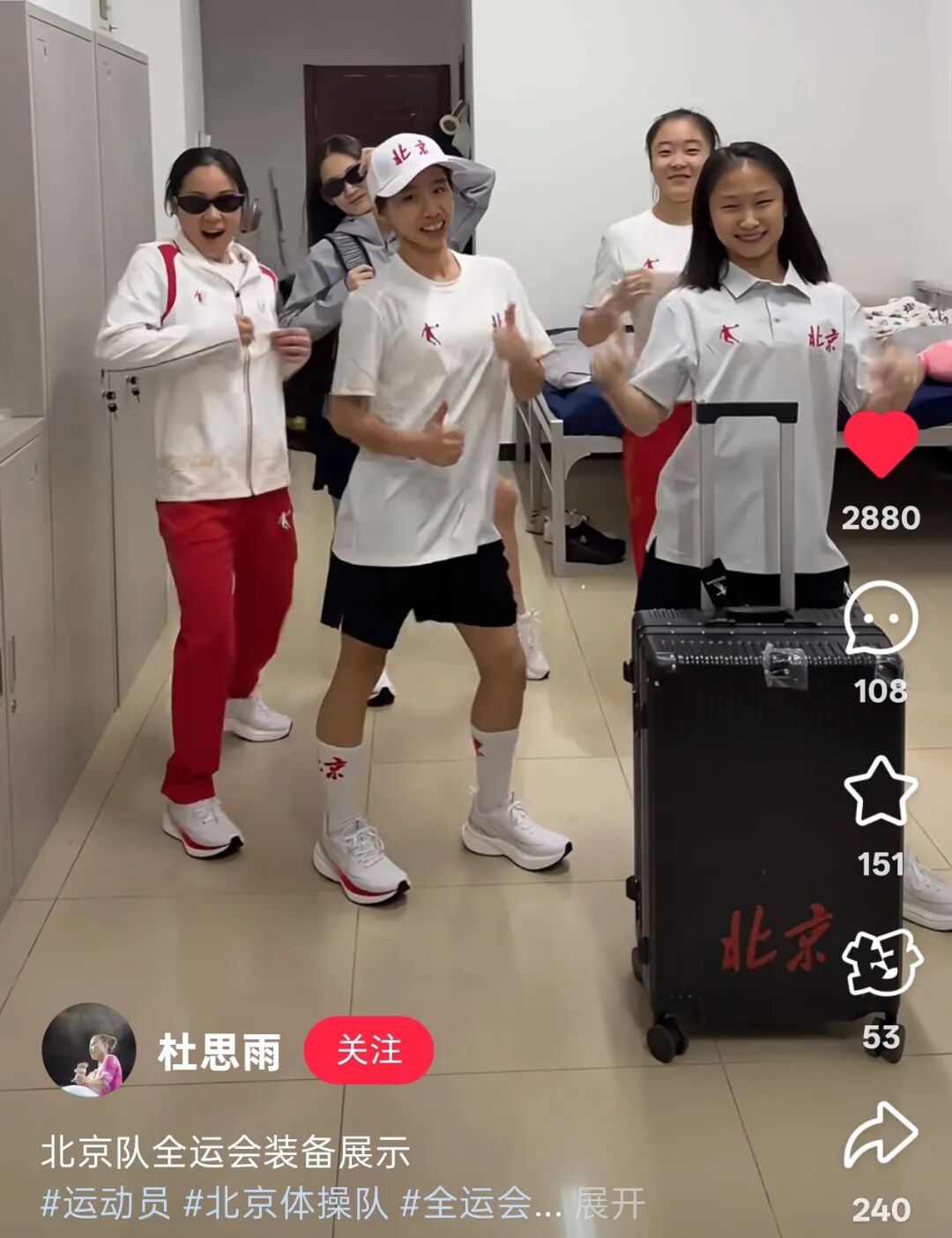 这类视频的内容本身有两个特点,一是由运动员亲自上身,展示收到的来自服装赞助商提供的装备;二是这些视频往往以走秀结合酷炫背景音乐的风格,兼具趣味和个性化。比如安徽省代表团的短跑运动员章贤和三级跳运动员成子轩联合发布在抖音的开箱视频,就收获了1.2万点赞和4500+转发;代表北京市出战全运会的体操名将杜思雨,也和队友合作拍摄了装备走秀视频,发布在小红书后获得了2800+点赞。
