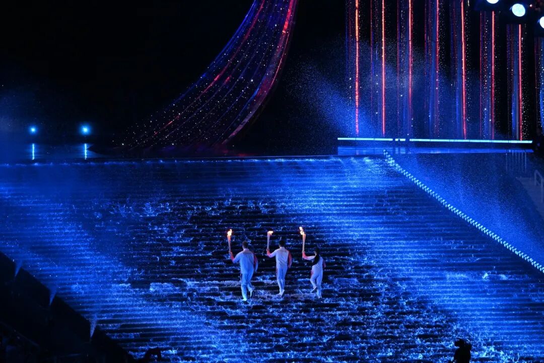 开幕式总导演郎昆在解读开幕式创意时指出,“水”与“岭南文化”被定为贯穿开幕式的两大核心线索,而最具湾区特色的视觉表达,正是通过水舞台的创新呈现来实现的。其中令人印象深刻的一个画面,无疑是火炬手们手擎火把、脚踩水浪的编排。