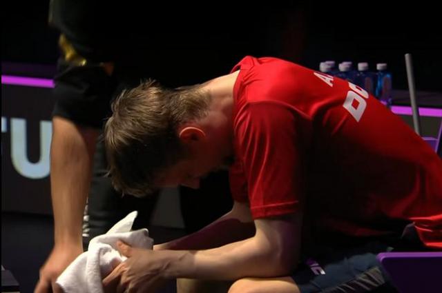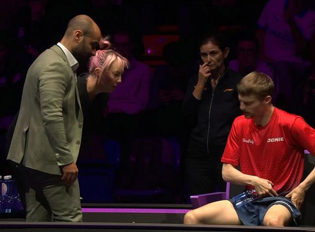 第三局,林德以3:0开局。此时他感觉腿部不适,向裁判申请了医疗暂停。实在是不巧,比赛关键时刻身体出现问题。