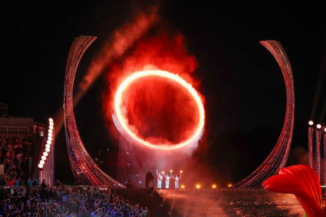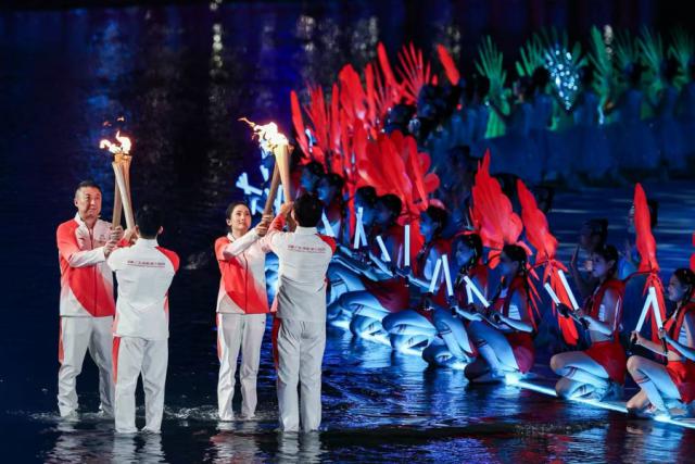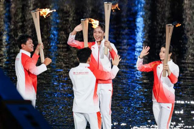 当代表粤港澳三地的点火火炬手——男子100米亚洲纪录保持者苏炳添、香港运动员张家朗、澳门运动员李祎一起点燃主火炬,环形火炬台缓缓升起,火焰汇聚成圆满的光环,照亮了运动员的拼搏之路,也映照出大湾区的美好未来。