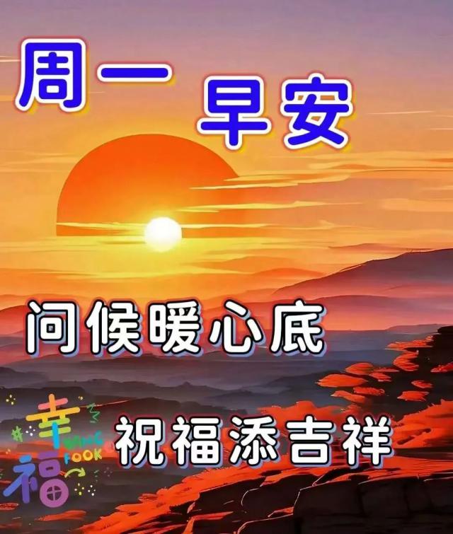 送上问候,愿风吹散烦恼,心情如云朵般晴朗;送上祝福,愿岁月流转,心意不变,幸福伴你左右;送上祈愿,愿你每天都好,心情舒畅,开心快乐。周一早上好!