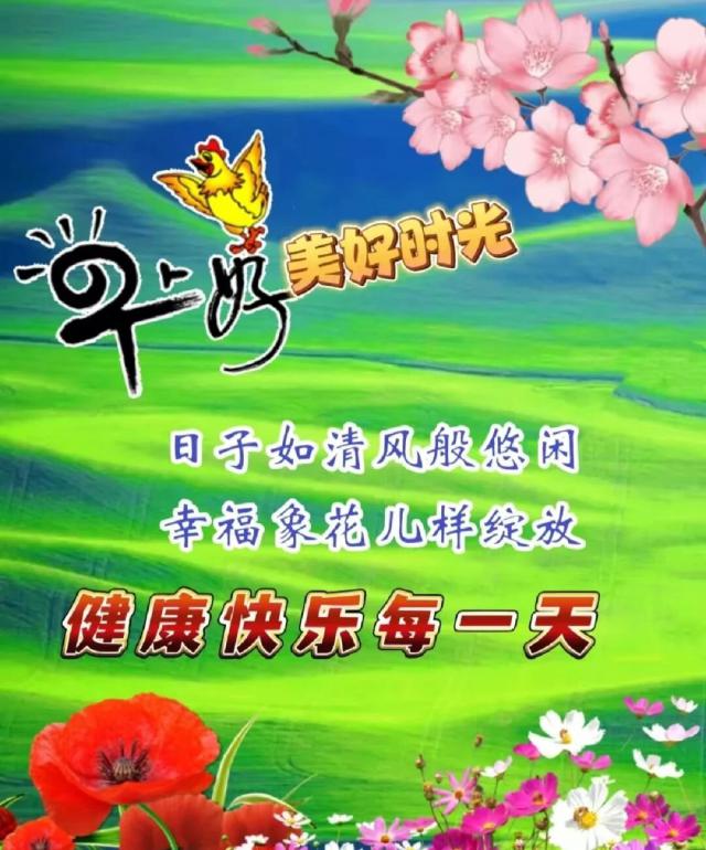 晨光洒下,新的一天开启,生活幸福美满,烦恼忧愁消散;事业蒸蒸日上,财源滚滚而来;心情愉悦欢喜,笑容常驻不老;快乐按时来到,幸福永远相伴。祝亲友每天都开心。