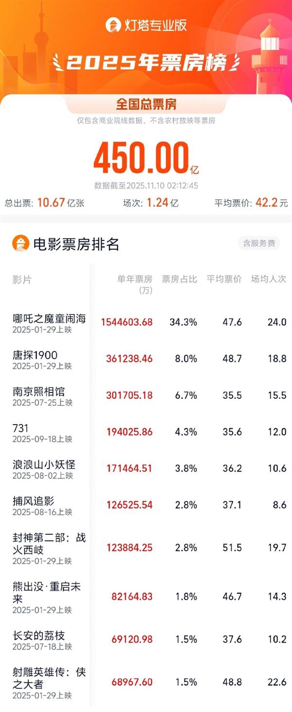 2025年电影总票房破450亿,《哪吒2》贡献超三分之一