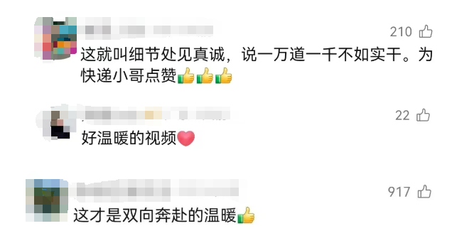 如此暖心的一幕,感动了邵女士,邵女士当即给小哥点赞和打赏,并把视频发到网上,评论区里挤满了留言,“这才是双向奔赴的温暖”。