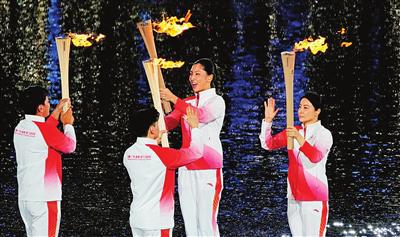 第十五届全运会圣火进入开幕式现场,第一棒火炬手是马琳、陈若琳,第二棒是黄金宝、方文浩,第三棒是郭晶晶、王欣瑜,第四棒是王柳懿、王芊懿,第五棒是梁伟铿、赖宣治,第六棒是冼东妹、容志行。最后,由广东田径短跑名将苏炳添、香港击剑名将张家朗、澳门武术名将李祎三位来自粤港澳三地的火炬手共同点燃主火炬,再次完美诠释了“三地融合”,现场掌声经久不息。