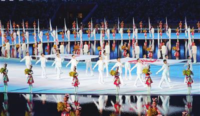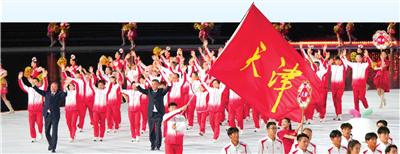暖场表演以《湾区潮涌》为主题,分为“潮起”“声漾”“雄风”“筑梦”四个部分,生动展现了粤港澳地区传统与现代相互交融、体育与艺术和谐共生的繁荣景象,让大家对开幕式充满了期待。在代表团入场环节,举重奥运冠军刘焕华高举天津代表团团旗,带领天津体育健儿入场。由广东、香港、澳门组成的“东道主代表团”,在三面代表团旗帜的引领下并排入场,这一画面充分体现了粤港澳三地同心同梦,现场掌声如雷。