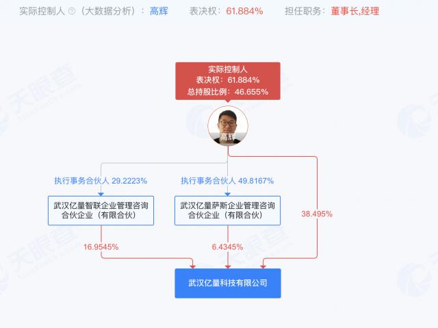 天眼查信息显示,亿量科技实际控制人为高辉,总持股比例达46.66%,表决权为61.88%。目前,高辉担任公司董事长兼经理。