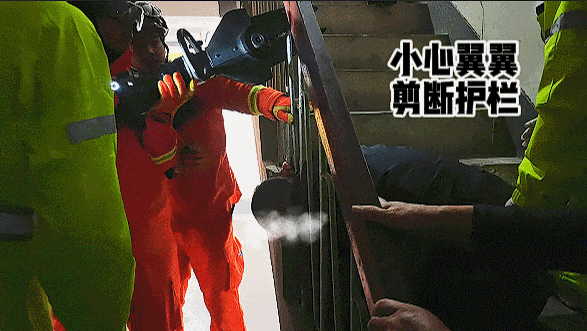 消防员赶到现场时,只见老人头部正牢牢卡在护栏缝隙中,其脸部紧贴着冰冷的楼梯面。为尽快将他救出,消防员决定使用破拆工具,小心剪断护栏,展开救援。