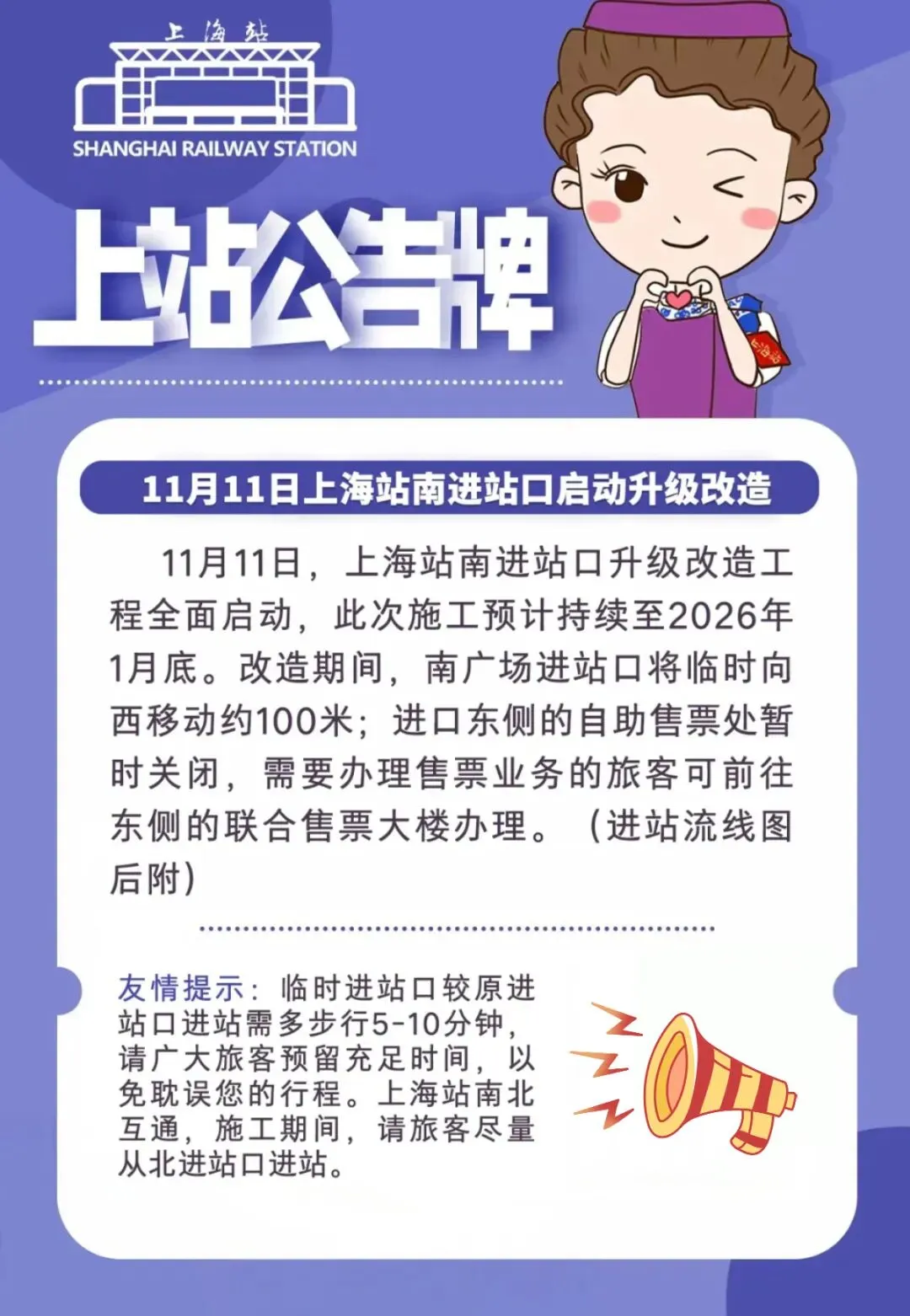 自11月11日起,上海站南进站口升级改造工程全面启动,此次施工预计会持续到2026年1月底。改造完成后,旅客的出行体验将得到进一步改善。