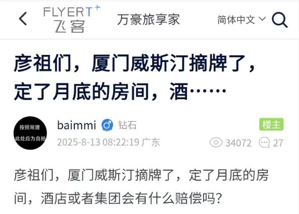 最近,我在飞客上看到一条帖子。有网友在【万豪旅享家】板块发帖称:“彦祖们,厦门威斯汀摘牌了,我定了月底的房间,酒店或者集团会有什么赔偿吗?”