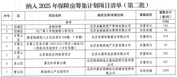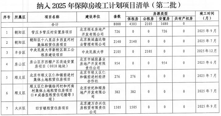 北京今年保障房任务超额完成,第二批计划新建1.98万套。今年年初,北京就定下了全年建设筹集保租房5万套(间),竣工各类保障房8万套(间)的任务,并且将其列入市政府实事之一。市住建委今日发布消息,截至10月底,上述任务已全面完成。同时,今年北京第二批保障性住房建设筹集计划也正式出炉。该批次计划新建17个保障房项目、房源1.98万套,筹集项目7个、0.24万套,竣工项目7个、房源0.81万套。根据计划,新开工建设的保障房项目共有17个,房源19780套。其中保租房项目10个、房源9968套;安置房项目7个、房源9812套。