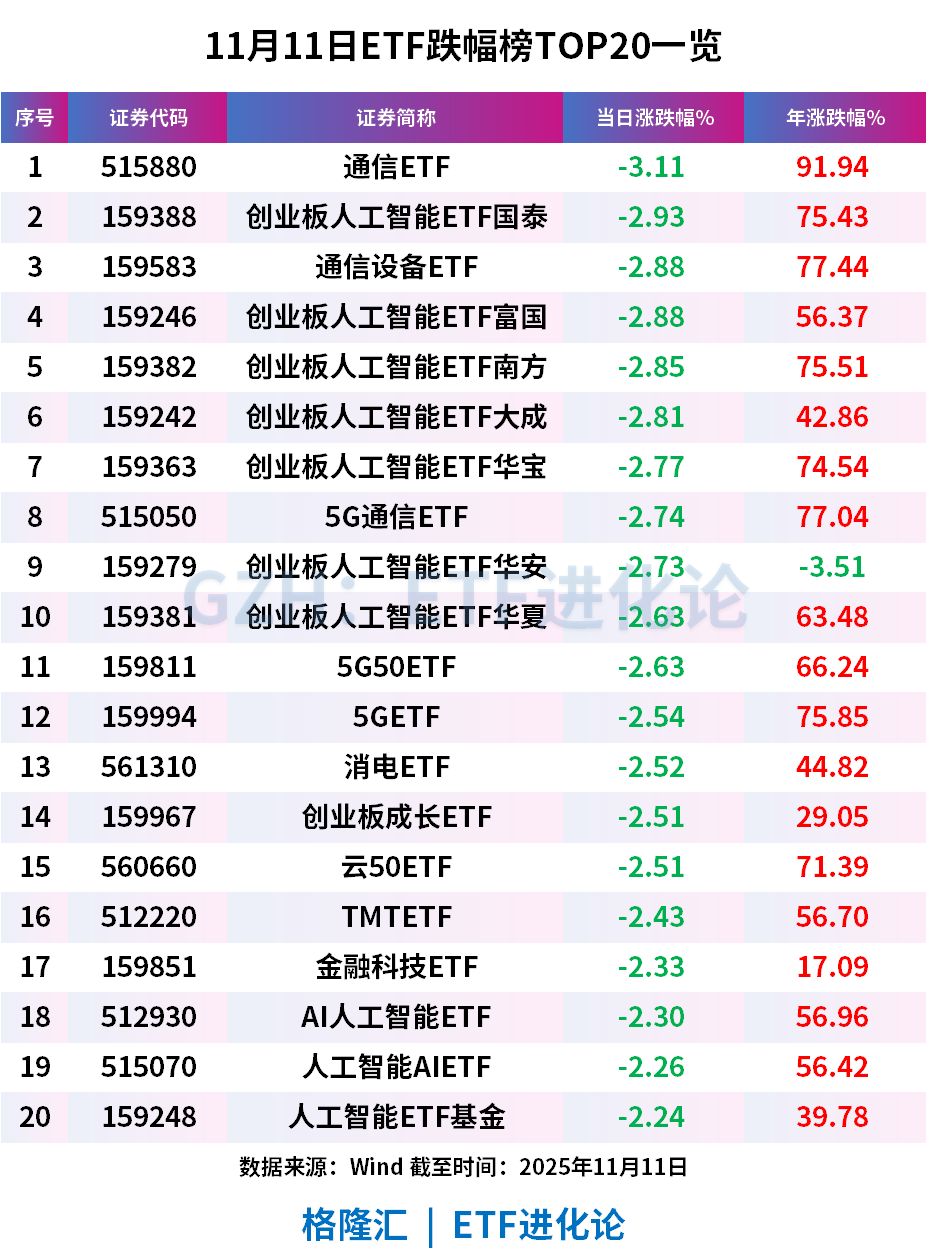 随着海外AI叙事短期有所降温,国内科技股今日继续全线回调,算力硬件领跌,通信ETF、创业板人工智能ETF国泰、通信设备ETF分别跌3.11%、2.93%和2.88%。