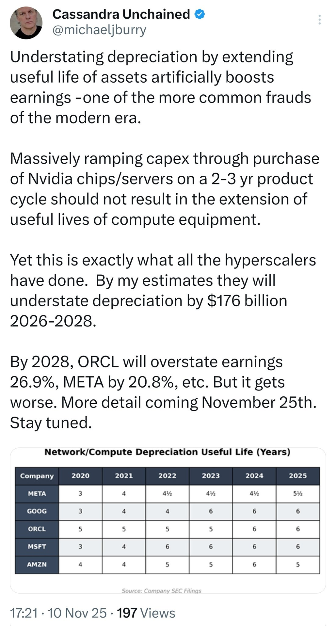 美东时间11月10日,“大空头”Michael Burry在社交媒体上发出新警告,指出大型科技公司正通过延长服务器与计算设备折旧年限来“美化财报”,这是当代常见的利润虚增手段之一。