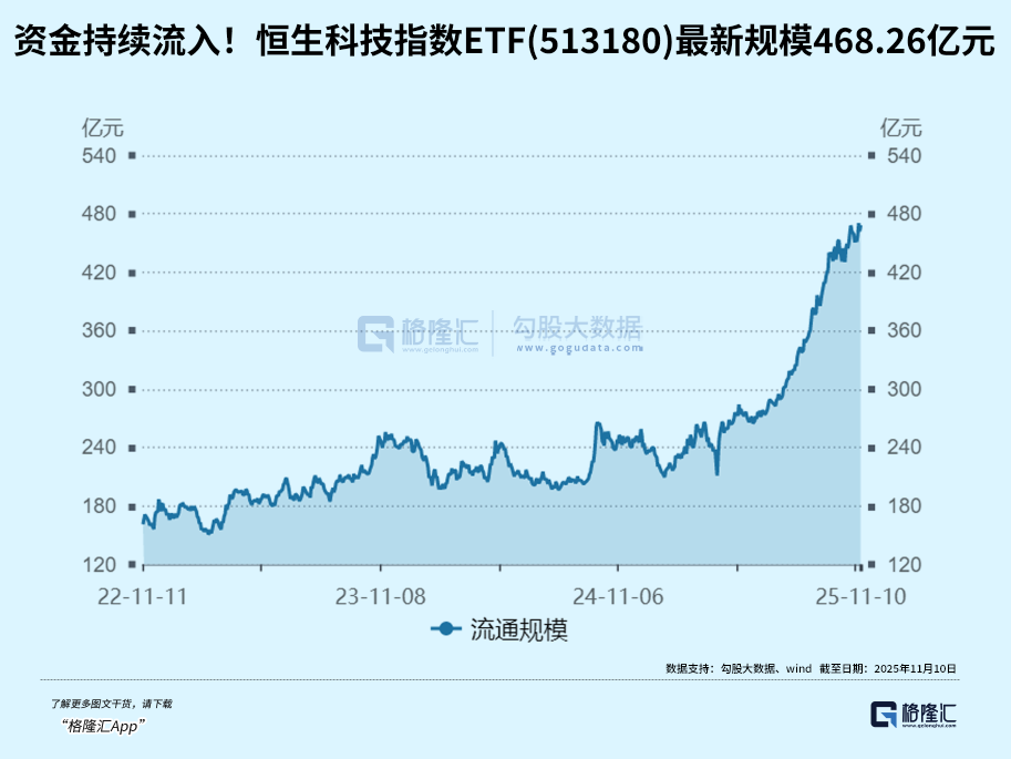 流动性是重要的估值因素。11月10日,南下资金净买入港股66.54亿港元,年内净买入额突破1.3万亿港元,自港股通开通以来累计净流入规模突破5万亿港元,刷新互联互通机制开通以来最高纪录。ETF成为内地投资者买入港股重要通道,其中恒生科技指数ETF(513180)近20日吸金47.34亿元,年内资金净买入162.83亿元,最新规模达468.26亿元。