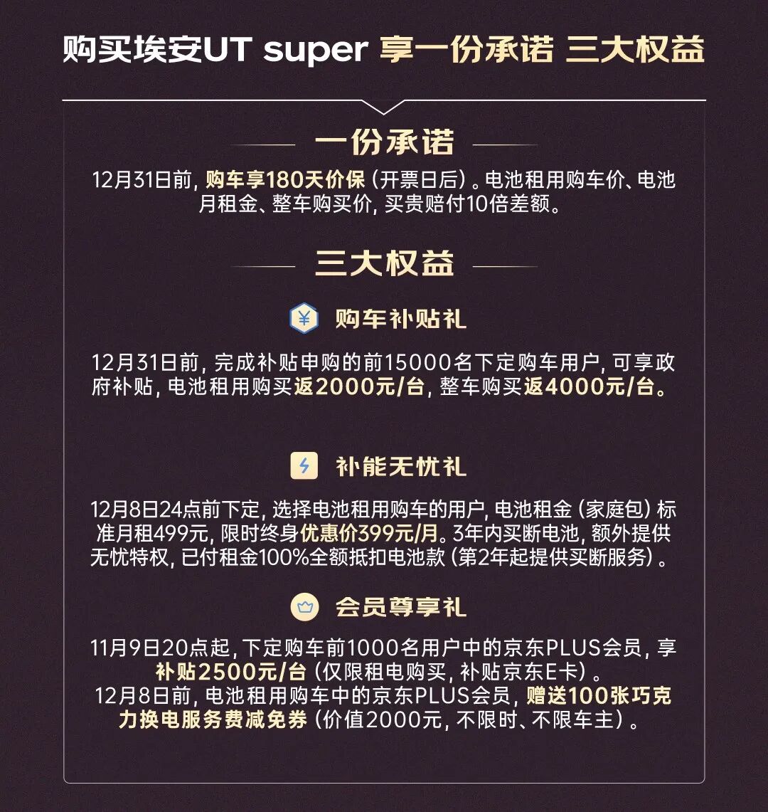4.99万元!京东联合广汽集团、宁德时代正式公布了“国民好车”埃安UT super的售价,租用电池购车价仅4.99万元,整车购买价为8.99万元,远低于市场预期,直接拉低了A级轿车的价格。