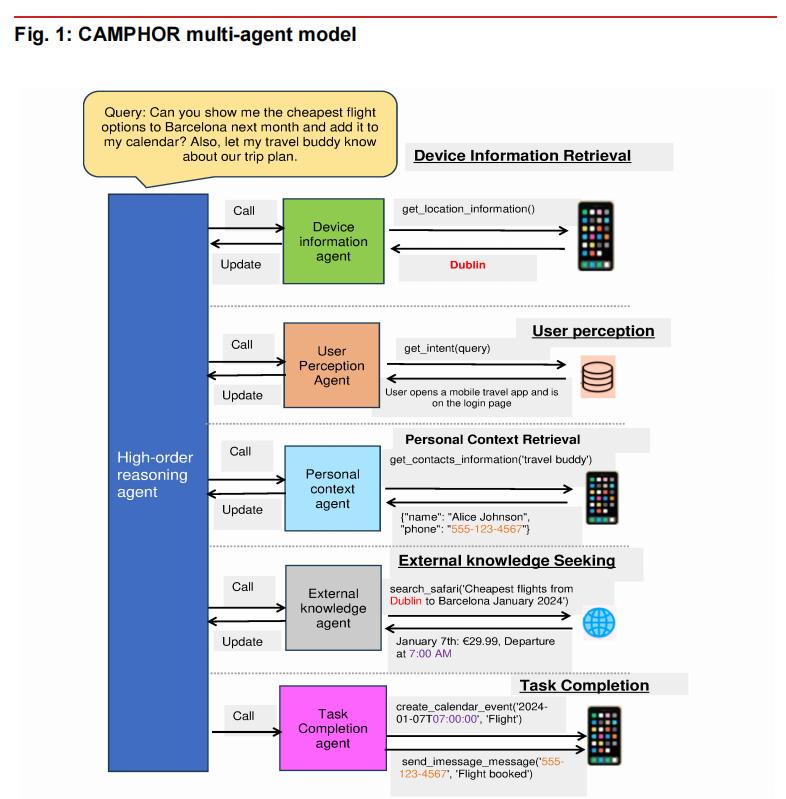 野村称,苹果近期发表的名为《CAMPHOR:用于多输入规划和设备上高阶推理的协作智能体》的论文,详细揭示了这一系统的内部运作机制。
