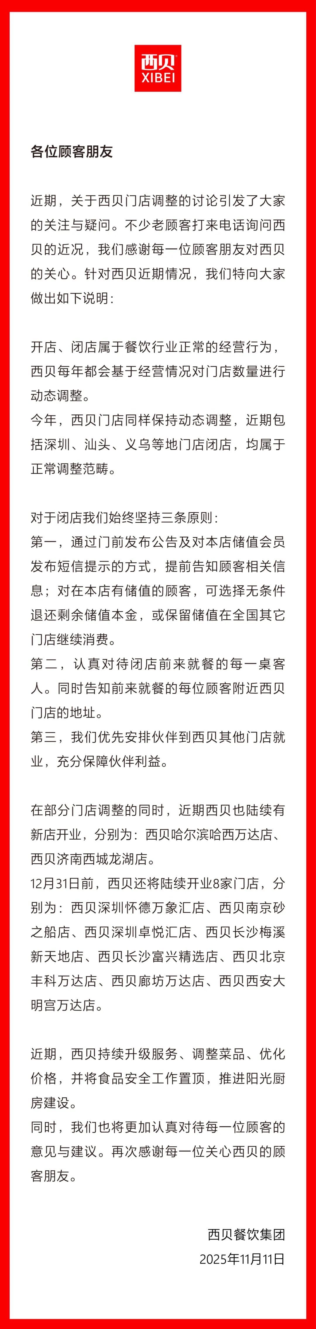 面对外界的疑虑,11月11日上午,西贝首次在官方层面向公众作出集中回应。公司称,近期部分城市的闭店行为属于正常的经营调整。与此同时,西贝的开店步伐并未停歇,并承诺在年底前还将陆续开业8家门店。