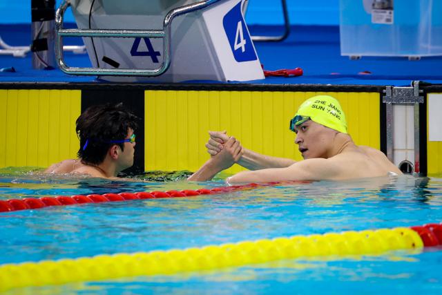 11月10日上午进行的400米自由泳预赛,赛后孙杨(右)与潘展乐(左)握手致意(王竟成摄)