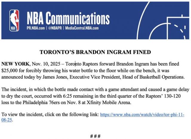 北京时间11月11日,NBA篮球运营总裁、执行副总裁詹姆斯 - 琼斯宣布,多伦多猛龙队前锋布兰登 - 英格拉姆因在替补席用力摔水瓶至地面,被处以2.5万美元罚款。