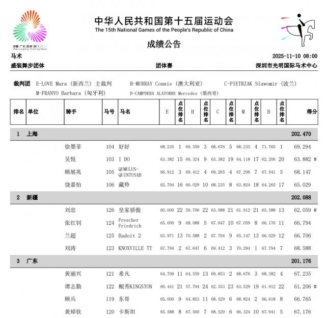 全运开幕后,深圳赛区首金诞生。11月10日上午,第十五届全国运动会马术比赛在深圳市光明国际马术中心正式开赛,首个比赛日决出盛装舞步团体赛金牌,上海队成功摘金,这是十五运正式开幕后深圳赛区诞生的首枚金牌。新疆队、广东队分获银、铜牌。