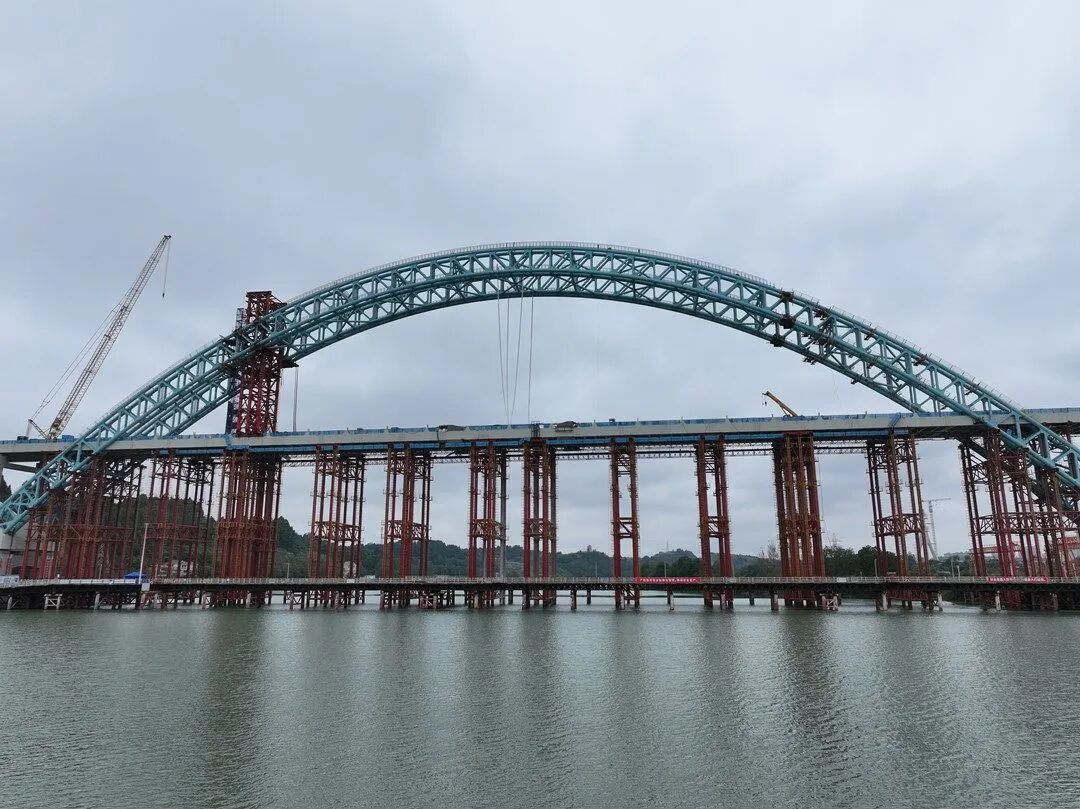 沱江特大桥位于成都简阳,全长1252米,由中铁大桥局承建。主拱提升合龙是全桥建设中难度最高、风险最大的环节。主拱重2200吨、长174米、需提升21.7米,且提升过程中拱肋4吊点高差不能超过20毫米,难度极大,堪比“空中绣花”。建设团队为此引入自动化监控、数字化管理平台,应用虚拟拼装技术,反复进行模拟演练,实时采集受力与位移数据,精准控制提升速度与姿态,以确保合龙精度达标。长江沿岸铁路集团四川有限公司成渝中线指挥部指挥长王学生介绍:“在施工现场,主拱提升至焊接点时,最高处距江面达103米,8名电焊工同时施焊,在数字化管理平台监控下精准焊接32个环口,合龙精准度与模拟结果高度一致。”