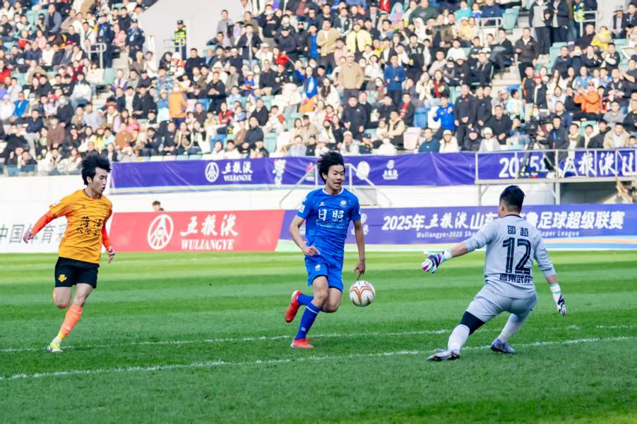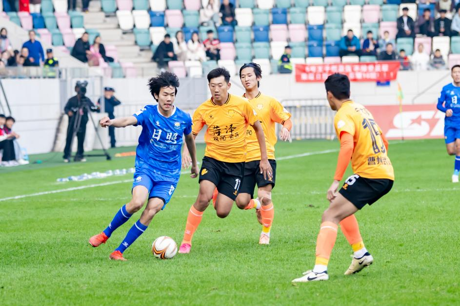 菏泽曹州队来势汹汹,其“武术 + 足球”的独特风格尽显锋芒。球员们凭借武术锻炼出的矫健身姿和充沛耐力,在攻防两端展开猛烈攻击,犀利的进攻多次考验日照队的防线。