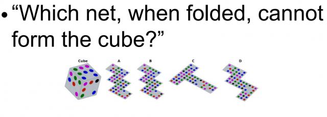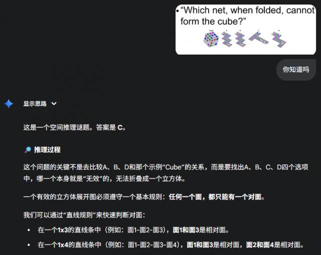 视觉处理考的不是简单识别图片内容,而是视觉推理,这对大模型来说很难。比如这道题:“下面这4个2D展开图里,哪一个不能折成左边那个立方体?”