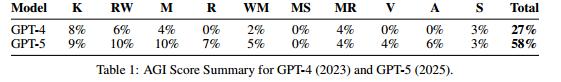 他们还顺便用GPT模型做了测试,结果显示,如果AGI满分是100分,GPT - 5只有58分,不及格。
