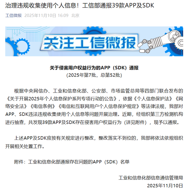 11月10日,工业和信息化部信息通信管理局发布通报,针对APP、SDK违法违规收集使用个人信息等问题展开治理。