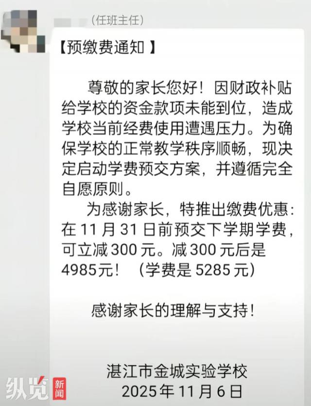 广东一校“预缴学费立减300元”通知引关注,校方否认,教育局回应