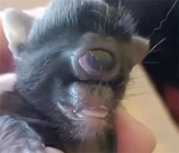这只小猫面部中央长着一只大眼睛,没有鼻子,上颚和下颚发育也不正常,属于典型的“独眼畸形”现象。