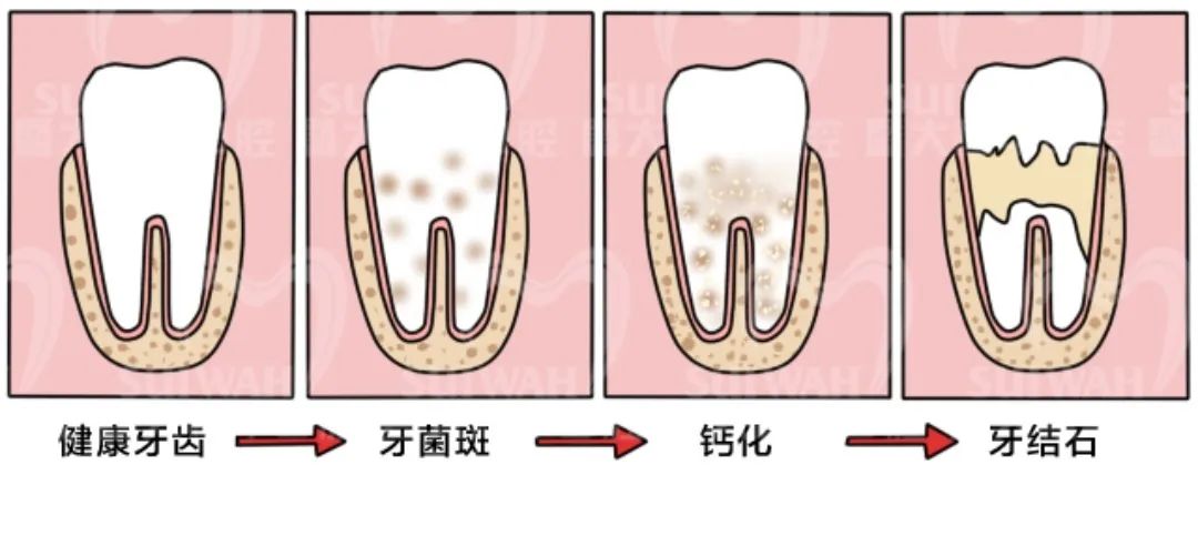 若牙菌斑未被彻底清除,就会越积越厚。同时,它会不断吸收唾液中的矿物质(尤其是钙、磷等元素),逐渐“石化”变硬。