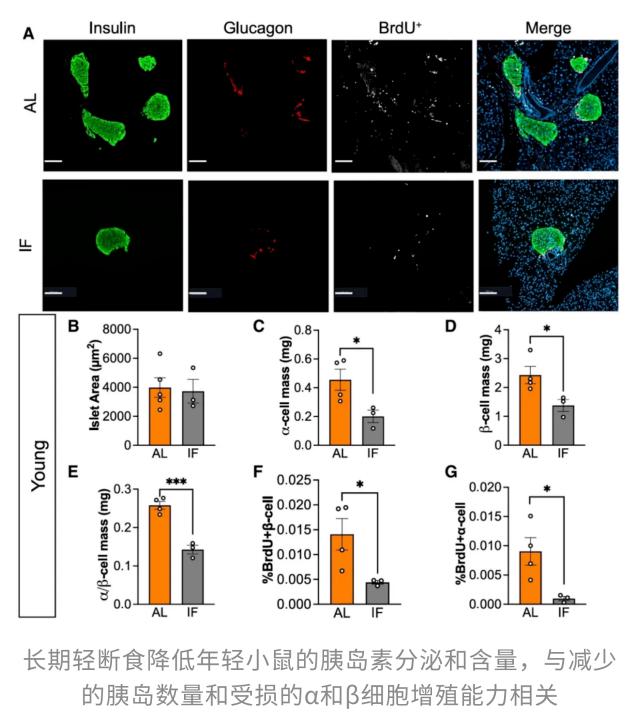 研究人员分析,长期轻断食看似让身体“休养生息”,但在年轻小鼠身上,会抑制胰岛中α细胞和β细胞增殖,使其难以正常成熟,与胰岛素分泌相关的基因表达水平也下降。随着影响累积,健康的β细胞失去分泌胰岛素能力,出现类似1型糖尿病的功能障碍。