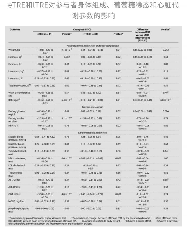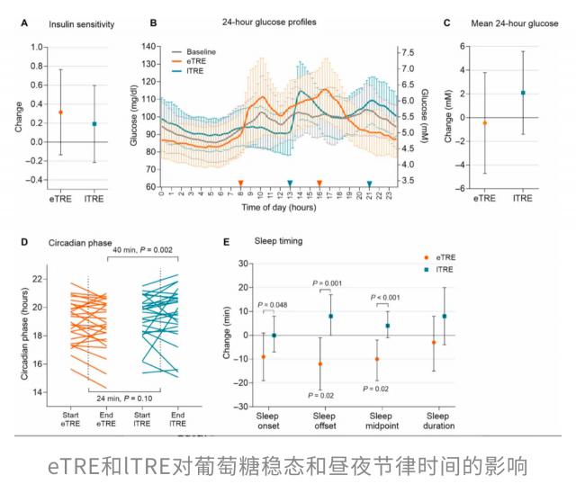 研究中最核心的代谢指标——胰岛素敏感性,在两种限时进食模式下均未改善。eTRE和lTRE组参与者胰岛素敏感性变化有限,组间差异也不显著。
