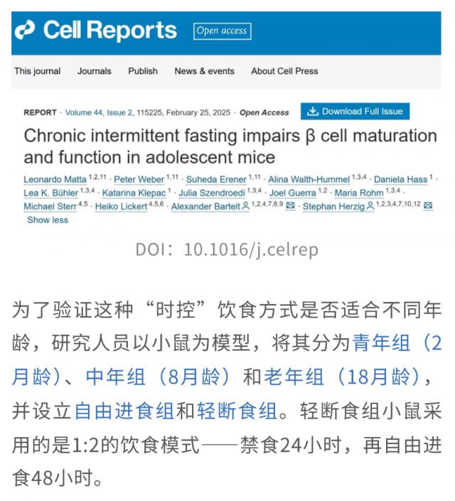 只“掐时间”、不制造热量缺口的轻断食对代谢改善不足。一些坚持轻断食的年轻人或许会觉得没什么恶劣影响,但发表于Cell Reports的研究表明,长期轻断食可能让年轻群体β细胞功能受损,增加未来代谢疾病风险。