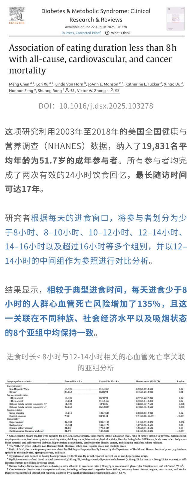 [3] Chen M, Xu L, Van Horn L, Manson JE, Tucker KL, Du X, Feng N, Rong S, Zhong VW. Association of eating duration less than 8h with all - cause, cardiovascular, and cancer mortality. Diabetes Metab Syndr. 2025 Aug 21:103278. doi: 10.1016/j.dsx.2025.103278. Epub ahead of print. PMID: 40849219.