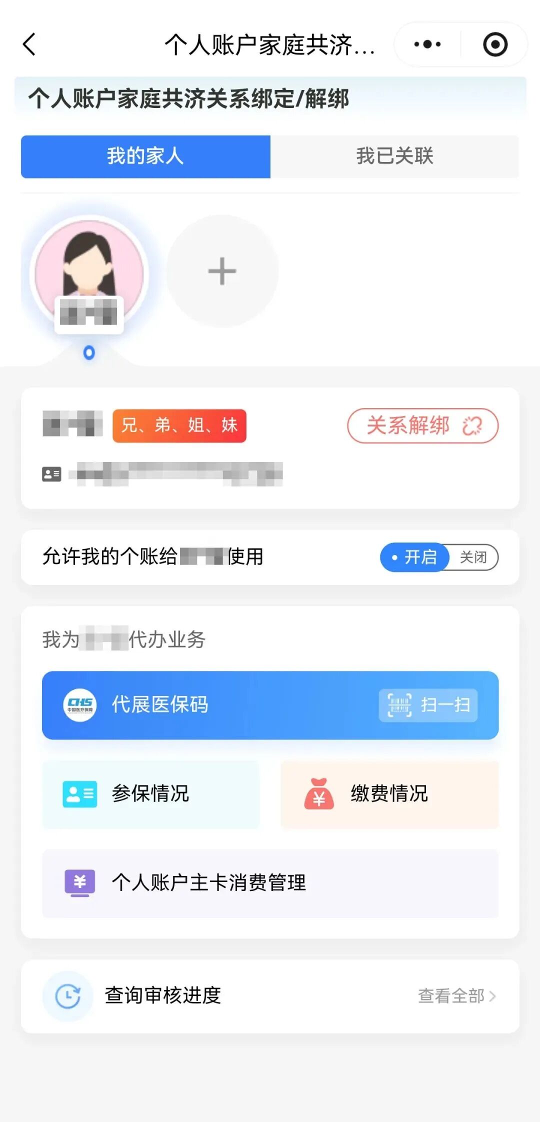 6.在【个人账户家庭共济关系绑定/解绑】页面中,可以查看到绑定是否成功以及绑定人员的信息。