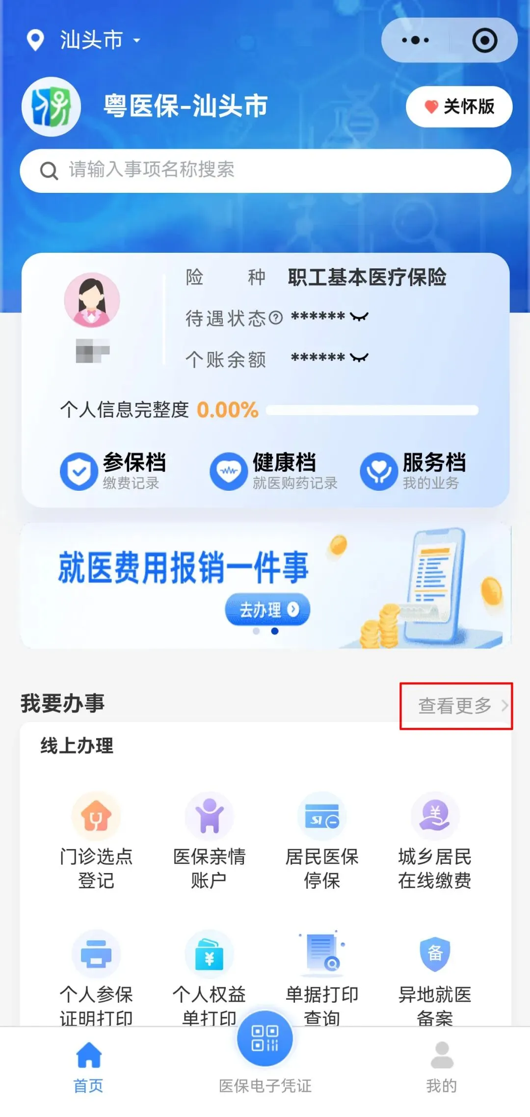 1.职工医保参保人登录【粤医保】微信小程序,在首页【我要办事】模块点击【查看更多】。