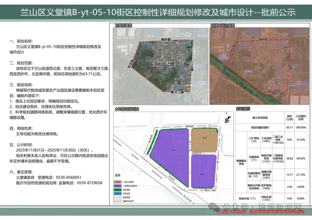 近日,兰山区自然资源局发布了义堂镇B - yt - 05 - 10街区和经开区B - lsik - 15街区控制性详细规划修改及城市设计的批前公示。