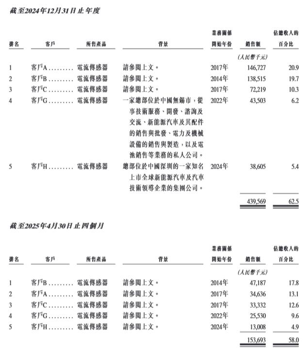 各期,希磁科技来自前五大客户的收入分别占总收入的65.2%、62.4%、62.5%及58%,来自最大客户的收入分别占有关期间总收入的31.3%、24.6%、20.9%及17.8%。