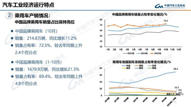 值得一提的是,从系别来看,中国品牌乘用车市场分额在10月再创历史新高,当月销量达214.8万辆,同比增长11.2%,销量占有率升至72.5%。今年前十个月,中国品牌乘用车市场份额升至69.4%,德系车份额则降至12.3%,日系车分额降至9.6%,美系车份额为5.9%,韩系车份额仅1.6%。