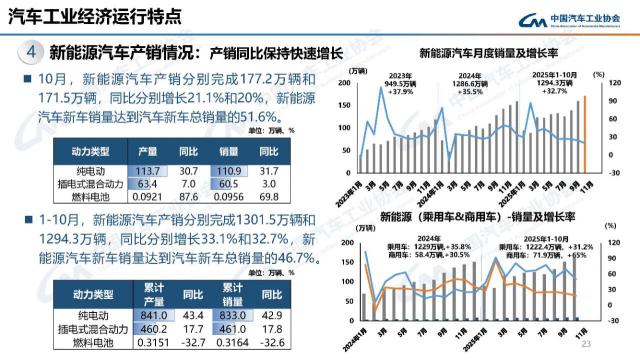 新能源车方面,新能源汽车产销分别完成177.2万辆和171.5万辆,同比分别增长21.1%和20%,新能源汽车新车销量达到汽车新车总销量的51.6%。今年前十个月,新能源汽车产销分别完成1301.5万辆和1294.3万辆,同比分别增长33.1%和32.7%。