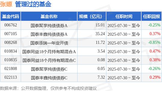 张嫄女士拥有中国国籍,是硕士研究生学历。她于2018年6月加入国泰基金,曾先后担任债券交易员、基金经理助理等职务。在2025年7月30日,她开始担任国泰同益18个月持有期混合型证券投资基金、国泰聚享纯债债券型证券投资基金、国泰添瑞一年定期开放债券型发起式证券投资基金、国泰丰鑫纯债债券型证券投资基金的基金经理。