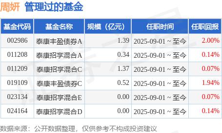 周妍女士拥有中国国籍,是博士学历。她于2020年12月加入泰康公募,目前担任泰康基金转债研究员以及基金经理。她曾在国泰君安证券研究所担任分析师。在2024年4月7日至2025年1月26日期间,她担任泰康招享混合型证券投资基金基金经理助理。从2025年9月1日至今,她担任泰康丰盈债券型证券投资基金、泰康招享混合型证券投资基金的基金经理。