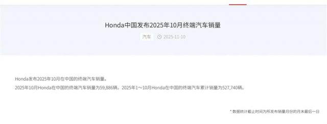 值得注意的是,飞度的困境也在一定程度上反映了本田在华市场的表现。本田公布的 2025 年 10 月中国市场终端汽车销量数据显示,其终端销量为 59,886 辆,同比下滑 20.6%,且这已是本田今年连续第 10 个月销量同比下滑。