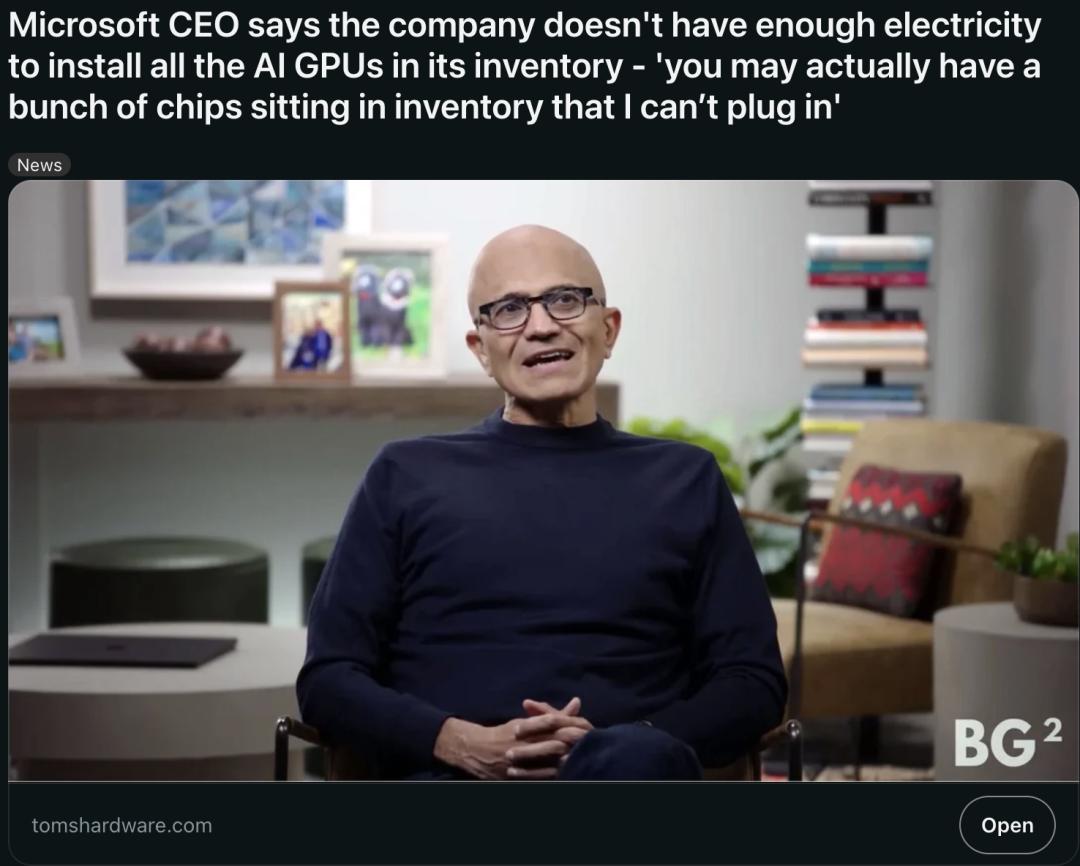 此前,微软的纳德拉公开承认,由于缺电,微软大量的GPU只能放在机架上闲置。