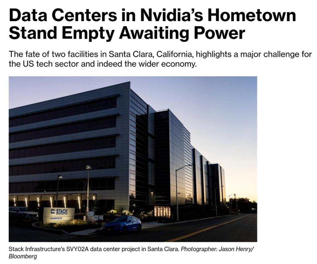 刚刚,彭博社爆料:加州圣克拉拉的两处数据中心已空置6年多,只能“独守空房”,等待电力供应。